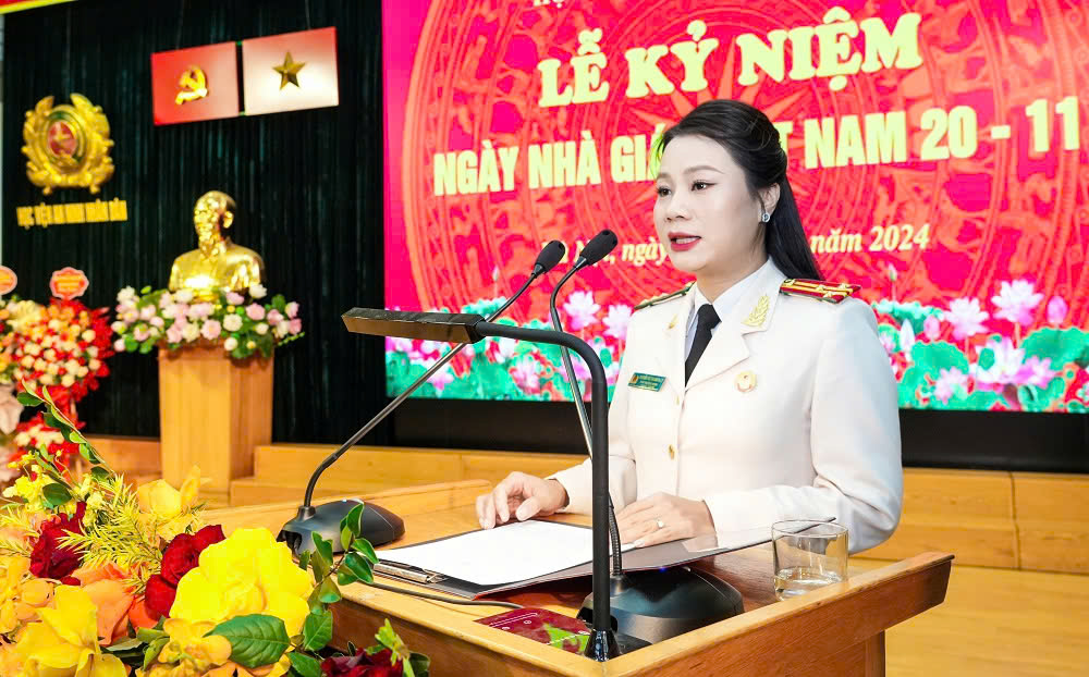 TS, Thượng tá Nguyễn Thị Thanh Thuỳ- Phó Trưởng khoa Luật, đại diện cho đội ngũ giảng viên và cán bộ quản lý giáo dục đang công tác tại Học viện trân trọng gửi lời tri ân sâu sắc tới các nhà giáo lão thành, các thầy, cô giáo, đội ngũ cán bộ quản lý giáo dục của Học viện; đồng thời xin hứa, với sứ mệnh cao cả của người giáo viên Công an nhân dân nguyện đem hết tâm lực, trí lực tiếp tục nỗ lực phấn đấu học tập bồi dưỡng, nâng cao năng lực chuyên môn, tiên phong trong nghiên cứu khoa học, tích cực đổi mới nội dung phương pháp dạy học, xây dựng và hoàn thiện hệ thống giáo trình, tài liệu dạy học, đáp ứng yêu cầu đào tạo nguồn nhân lực chất lượng cao, góp phần xây dựng và phát triển Học viện trở thành cơ sở giáo dục trọng điểm, trung tâm nghiên cứu khoa học uy tín của ngành Công an.