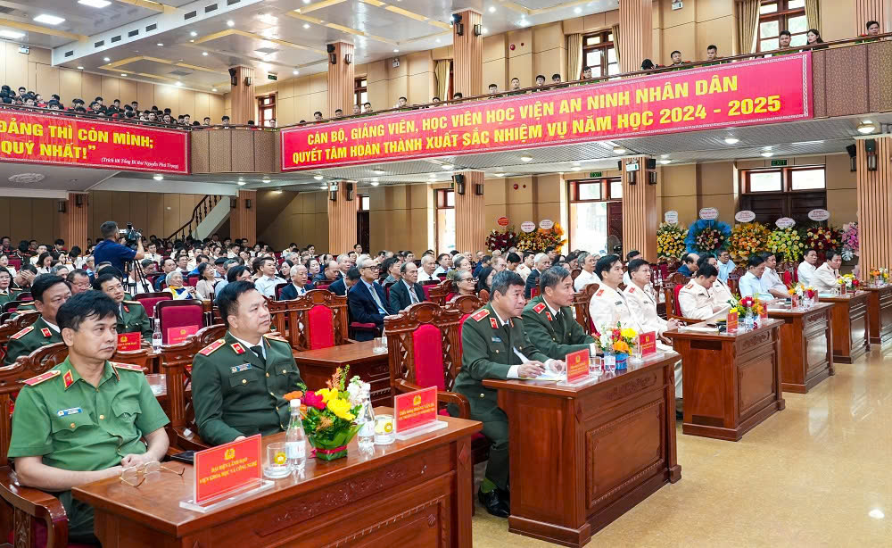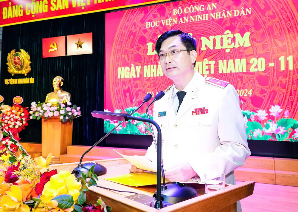 Phát biểu tại buổi Lễ, đồng chí Giám đốc Học viện nhấn mạnh, Học viện ANND là cơ sở giáo dục đại học trọng điểm, là trung tâm nghiên cứu khoa học hàng đầu của lực lượng Công an nhân dân. Những thành tựu, kết quả đã đạt được của Học viện là công sức đóng góp của các thế hệ nhà giáo, cán bộ quản lý giáo dục qua các thời kỳ luôn nỗ lực phấn đấu, đoàn kết, xây dựng Học viện ngày càng phát triển, góp phần to lớn, quan trọng vào sự nghiệp cách mạng vẻ vang của lực lượng Công an nhân dân. Nối tiếp truyền thống của Học viện, đội ngũ các nhà giáo, cán bộ quản lý giáo dục, cán bộ tham mưu phục vụ công tác giáo dục, đào tạo của Học viện đã không ngừng nỗ lực, phấn đấu, đồng tâm, nhất trí đạt được nhiều kết quả và thành tích đáng ghi nhận. Năm học 2023 - 2024, Đảng ủy, Ban Giám đốc Học viện tiếp tục kiện toàn tổ chức bộ máy của Học viện theo Đề án số 19 của Bộ Công an; tập trung lãnh đạo, chỉ đạo các đơn vị chức năng chủ động cập nhật nội dung, chương trình đào tạo, đổi mới phương pháp giảng dạy, thực tập, thi tốt nghiệp nhằm không ngừng nâng cao chất lượng giáo dục, đào tạo, đáp ứng yêu cầu nhiệm vụ trong tình hình mới.