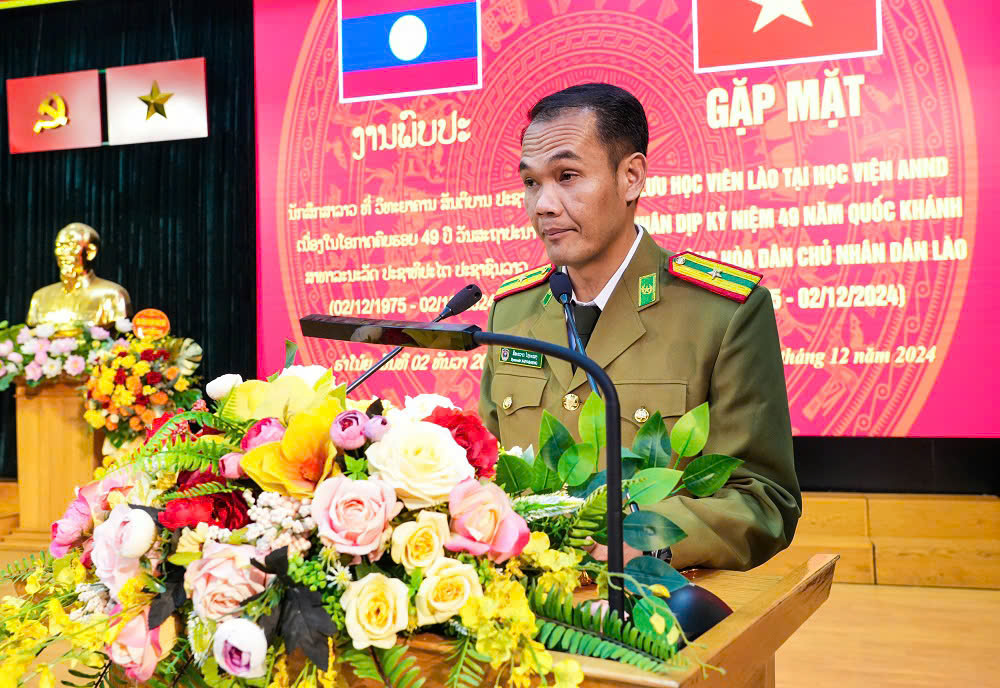 Phát biểu tại buổi gặp mặt, Trung tá Sỷ Sạ Vạt Xay Nha Sẻng - đại diện cho lưu học viên Lào đang học tập tại Học viện trân trọng gửi lời cảm ơn sự quan tâm đặc biệt của Bộ Công an Việt Nam, Đảng uỷ, Ban Giám đốc Học viện ANND; sự giúp đỡ nhiệt tình của lãnh đạo các đơn vị, cán bộ, giảng viên, học viên Học viện; đồng thời xin hứa sẽ cố gắng, nỗ lực, phấn đấu học tập, nghiên cứu để đạt thành tích cao, vận dụng linh hoạt, sáng tạo những kiến thức đã được lĩnh hội vào thực tiễn công tác, góp phần xây dựng và bảo vệ sự nghiệp cách mạng Lào và thắt chặt, củng cố hơn nữa tinh thần đoàn kết đặc biệt, hợp tác toàn diện giữa hai dân tộc Việt Nam - Lào.
