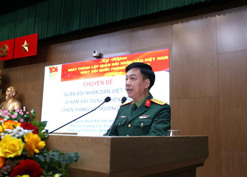 Đại tá Nguyễn Thế Mạnh báo cáo chuyên đề “Quân đội nhân dân Việt Nam - 80 năm xây dựng, chiến đấu, chiến thắng và trưởng thành”. |