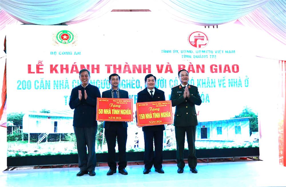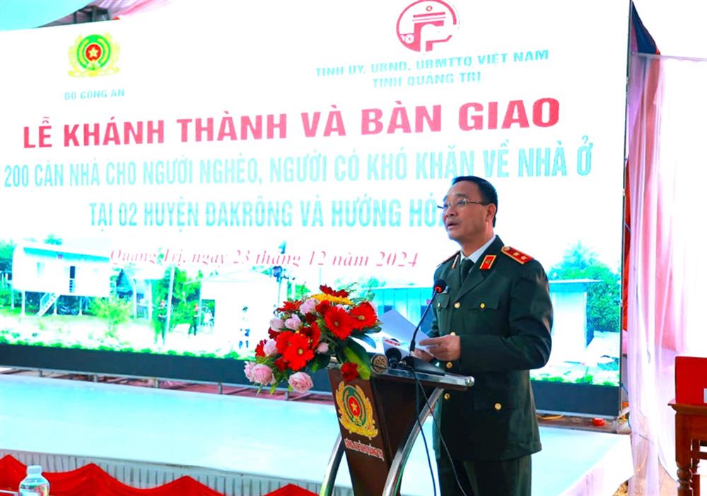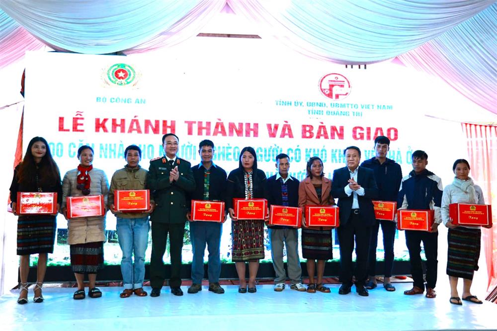 Ngày 23/12/2024, tại huyện Đakrông, tỉnh Quảng Trị, Bộ Công an phối hợp với Tỉnh ủy, Ủy ban nhân dân, Ủy ban Mặt trận Tổ quốc Việt Nam tỉnh Quảng Trị tổ chức Lễ khánh thành và bàn giao 200 căn nhà cho người nghèo, người có khó khăn về nhà ở tại 02 huyện Đakrông và Hướng Hóa.