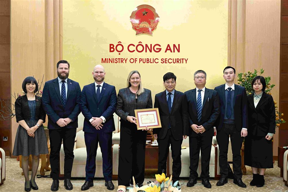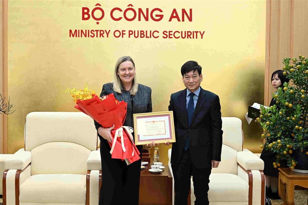 Sáng ngày 16/01/2025, tại Hà Nội, Bộ Công an đã tổ chức Lễ trao Kỷ niệm chương “Bảo vệ An ninh Tổ quốc” cho bà Jennifer Cullen, Trưởng Sỹ quan Liên lạc Cảnh sát Liên bang Australia tại Việt Nam.