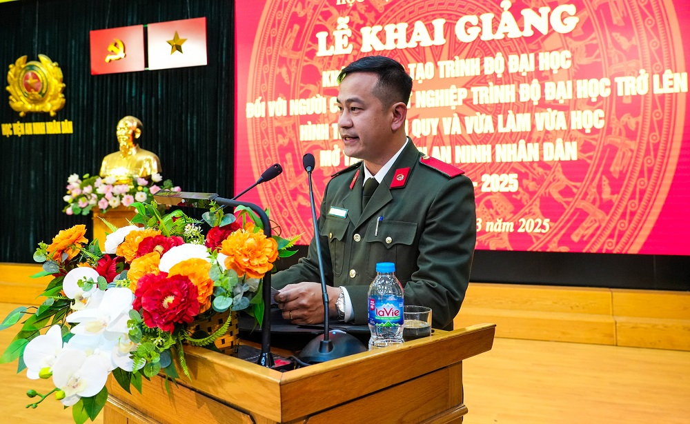 Phát biểu cảm tưởng tại buổi Lễ, học viên Ngô Văn Cương, đại diện cho học viên các lớp gửi lời cảm ơn sâu sắc đến lãnh đạo Bộ Công an, Đảng ủy, Ban Giám đốc Học viện, các đơn vị chức năng của Học viện, các thầy giáo, cô giáo đã quan tâm, tạo mọi điều kiện cho học viên; đồng thời xin hứa sẽ không ngừng phấn đấu, cố gắng học tập, rèn luyện vượt qua mọi khó khăn để đạt được kết quả học tập cao nhất.