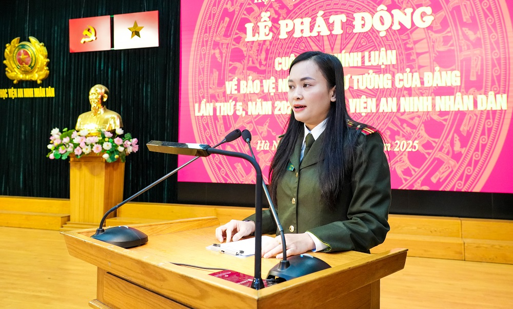 Phát biểu hưởng ứng Lễ phát động, TS, Thiếu tá Nguyễn Thị Minh Huệ, giảng viên Khoa Lý luận chính trị và khoa học xã hội nhân văn - đại diện cho cán bộ, giảng viên Học viện cho biết, cuộc thi là cơ hội để mỗi cán bộ, giảng viên tiếp tục tuyên truyền, lan tỏa, nâng cao nhận thức, trách nhiệm về nhiệm vụ bảo vệ nền tảng tư tưởng của Đảng; đồng thời cũng là dịp để phát hiện, lựa chọn, đào tạo, bồi dưỡng cán bộ, giảng viên có tiềm năng để trở thành lực lượng nòng cốt tham gia bảo vệ nền tảng tư tưởng của Đảng.