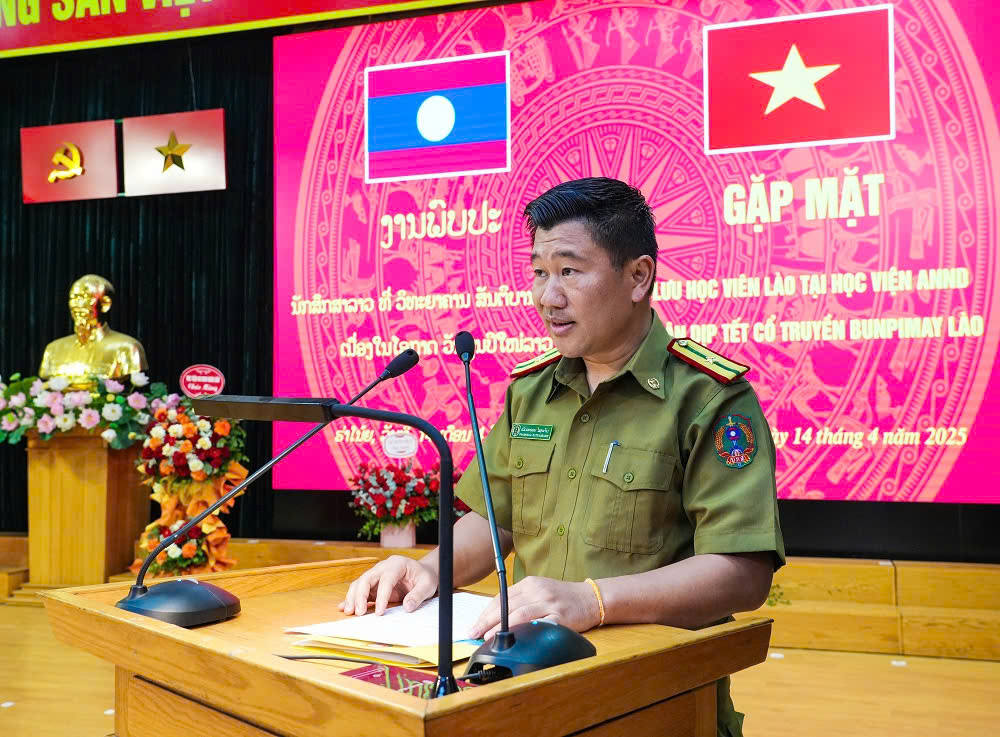 Phát biểu tại buổi gặp mặt, Trung tá Phết La Khon Xay Nha Chăn - đại diện cho lưu học viên Lào đang học tập tại Học viện bày tỏ niềm xúc động và trân trọng gửi lời cảm ơn Bộ Công an Việt Nam, Đảng uỷ, Ban Giám đốc Học viện ANND, lãnh đạo các đơn vị, cán bộ, giảng viên, học viên Học viện đã luôn quan tâm, tạo điều kiện giúp đỡ trong học tập, sinh hoạt và tổ chức buổi gặp mặt đón Tết cổ truyền thật ý nghĩa, đầm ấm.