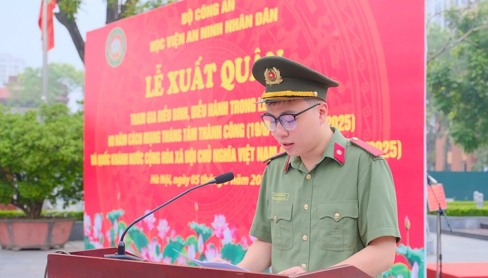 Phát biểu nhận nhiệm vụ tại buổi Lễ, học viên Cao Tiến Minh, Lớp B1D54 - đại diện cho cán bộ, giảng viên, học viên tham gia diễu binh, diễu hành bày tỏ lòng biết ơn sâu sắc sự hy sinh của các thế hệ cha anh; đồng thời xin hứa ra sức luyện tập, giữ vững kỷ luật, khắc phục khó khăn, hoàn thành xuất sắc nhiệm vụ mà Đảng, Bộ Công an và Học viện tin tưởng giao phó.
