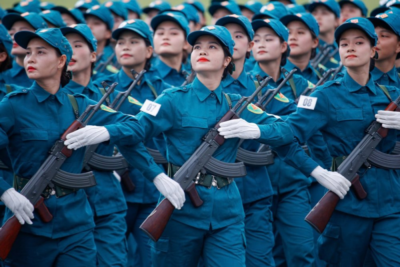Khối nữ dân quân các dân tộc Việt Nam tham gia diễu binh.