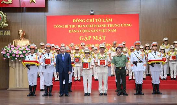 Tổng Bí thư Tô Lâm và Đại tướng Lương Tam Quang, Ủy viên Bộ Chính trị, Bộ trưởng Bộ Công an trao tặng biểu trưng tôn vinh điển hình tiên tiến cho các tập thể và cá nhân tiêu biểu xuất sắc (Đại tá, PGS.TS Trần Lệ Thanh, Trưởng Phòng Quản lý đào tạo và bồi dưỡng nâng cao Học viện ANND, thứ 4 từ trái sang).
