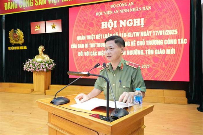 Tại Hội nghị, PGS.TS, Thiếu tướng Trần Anh Vũ - Phó Giám đốc Học viện, đã nêu rõ vai trò, ý nghĩa quan trọng của Kết luận số 116-KL/TW của Ban Bí thư và Chương trình hành động số 55-CTr/ĐUCA của Đảng ủy Công an Trung ương với mục tiêu nâng cao nhận thức của đội ngũ cán bộ, chiến sĩ về hiện tượng tín ngưỡng, tôn giáo mới và chủ trương, công tác đối với vấn đề này. Đồng chí Phó Giám đốc đã chỉ đạo các đơn vị nghiên cứu, quán triệt sâu sắc Kết luận số 116-KL/TW và tổ chức thực hiện nghiêm túc Chương trình hành động của Đảng ủy Công an Trung ương thực hiện Kết luận số 116-KL/TW; trên cơ sở đó, tạo nên sự thống nhất về nhận thức và tạo sự chuyển biến tích cực trong nghiên cứu, bổ sung lý luận nghiệp vụ an ninh và quán triệt trong công tác đào tạo, bồi dưỡng cán bộ Công an, góp phần xây dựng lực lượng Công an đáp ứng yêu cầu công tác đối với hiện tượng tín ngưỡng, tôn giáo mới. Cập nhật các chủ trương, nội dung công tác tại Kết luận số 116-KL/TW vào các giáo trình, tài liệu dạy học. Rà soát, bổ sung nội dung chuyên đề công tác đối với các hiện tượng tín ngưỡng, tôn giáo mới vào chương trình giảng dạy, bồi dưỡng lực lượng Công an. Bổ sung, cập nhật định hướng nghiên cứu khoa học về công tác đối với hiện tượng tín ngưỡng, tôn giáo mới. Thường xuyên tổ chức nghiên cứu lý luận, thực hiện hội thảo khoa học, đề tài khoa học các cấp; đề tài luận án, luận văn, đề án tốt nghiệp, khóa luận tốt nghiệp, sinh viên nghiên cứu khoa học về chủ đề công tác đối với hiện tượng tín ngưỡng, tôn giáo mới. Phối hợp với Cục An ninh nội địa và Công an các địa phương tiến hành tổng kết thực tiễn về công tác với các hiện tượng tín ngưỡng, tôn giáo mới khi có yêu cầu.