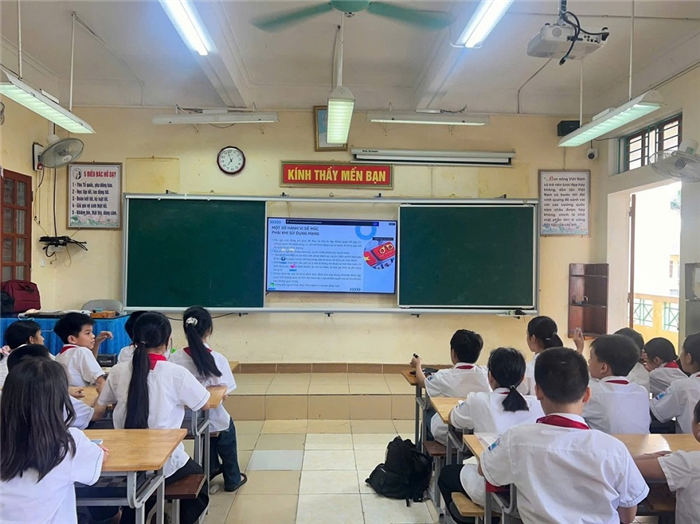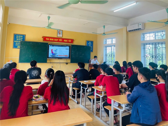 Học sinh tham gia tập huấn quan truyền hình trực tuyến tại lớp học.