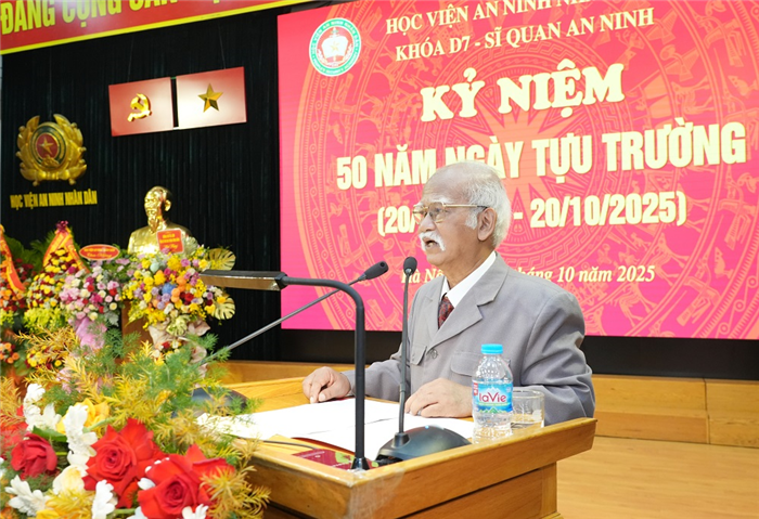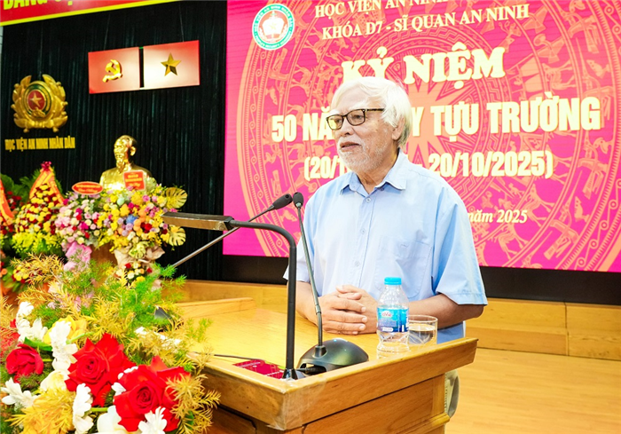 Thay mặt cho các thầy cô giáo từng trực tiếp giảng dạy Khóa D7, TS. Vũ Phạm Quyết Thắng - nguyên Phó Tổng Thanh tra Chính phủ, nguyên giảng viên Khoa Chính trị đã bày tỏ niềm xúc động, tự hào khi được gặp lại các cựu học viên; ấn tượng, tự hào với các thành tích mà các cựu học viên đã đạt được trong suốt 50 năm qua. TS. Vũ Phạm Quyết Thắng khẳng định, các cựu học viên Khóa D7 chính là tấm gương cho các khóa, các thế hệ học viên Học viện ANND tiếp tục noi theo.