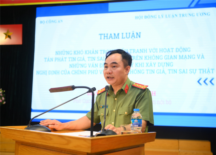 Đồng chí Đại tá Nguyễn Huy Khích, Phó Cục trưởng Cục An ninh chính trị nội bộ đã chia sẻ những khó khăn trong đấu tranh với hoạt động phát tán tin giả, tin sai sự thật trên không gian mạng và những vấn đề cần lưu ý khi xây dựng Nghị định của Chính phủ về phòng chống tin giả, tin sai sự thật. Trong đó, xu hướng phát tán tin giả, tin sai sự thật đang trở thành vấn nạn tại Việt Nam và nhiều quốc gia; Việt Nam hiện chưa có văn bản quy phạm pháp luật chuyên biệt điều chỉnh hoạt động này, chế tài xử lý chưa đủ sức răn đe. Hiện Bộ Công an đang được giao xây dựng Nghị định của Chính phủ về phòng chống tin giả, tin sai sự thật. Đây cũng sẽ là văn bản quy phạm pháp luật chuyên biệt đầu tiên, có ý nghĩa quan trọng trong lĩnh vực này.