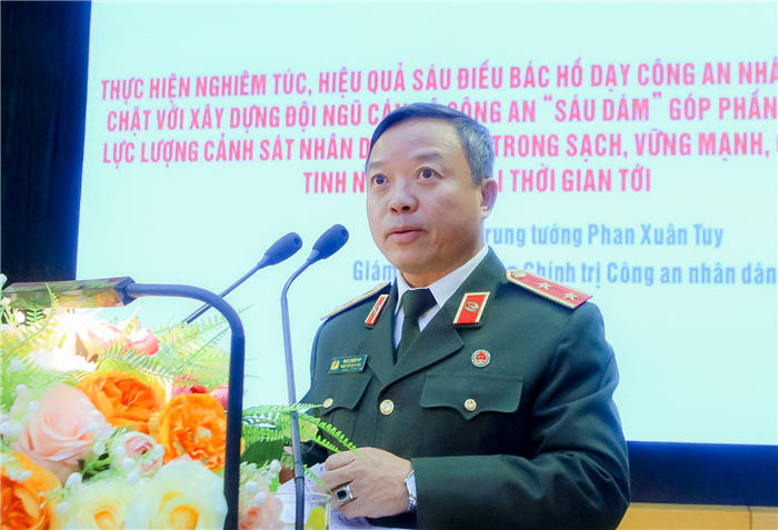 Tham luận của PGS.TS, Trung tướng Phan Xuân Tuy, Giám đốc Học viện Chính trị Công an nhân dân, nhấn mạnh việc thực hiện nghiêm túc "Sáu điều Bác Hồ dạy" gắn liền với việc xây dựng đội ngũ cán bộ có tinh thần “Sáu dám” (dám nghĩ, dám làm, dám nói, dám chịu trách nhiệm, dám đột phá, sáng tạo, dám đương đầu). Đây không chỉ là yêu cầu về phẩm chất mà còn là kim chỉ nam hành động để Công an cấp cơ sở trở thành lực lượng thật sự trong sạch, vững mạnh, chính quy, tinh nhuệ, hiện đại. Thẳng thắn chỉ ra những hạn chế như suy thoái đạo đức và thiếu tinh thần hành động, từ đó đề xuất các giải pháp chiến lược từ trách nhiệm cấp ủy, tuyên truyền giáo dục, đến việc thực hiện nghiêm trách nhiệm nêu gương.