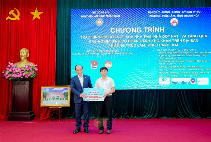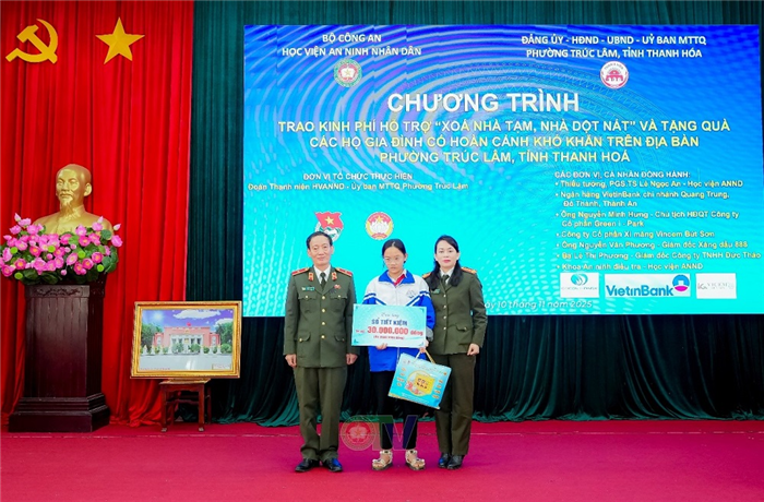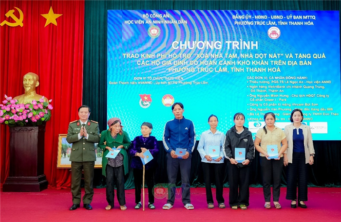 Ngày 10/11/2025, Học viện An ninh nhân dân (ANND) đã phối hợp các đơn vị, doanh nghiệp đồng hành tổ chức chương trình thiện nguyện trao kinh phí hỗ trợ xóa nhà tạm, nhà dột nát và tặng quà các gia đình chính sách tại phường Trúc Lâm, tỉnh Thanh Hóa.