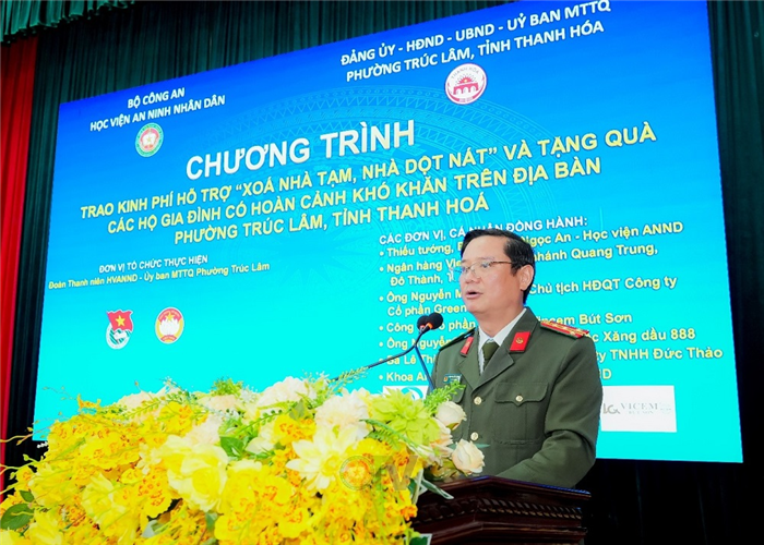 Phát biểu tại chương trình, thừa ủy quyền của Đảng ủy, Ban Giám đốc Học viện ANND, PGS.TS, Đại tá Chu Quang Thiện, Ủy viên Ban thường vụ Đảng ủy, Trưởng Phòng Chính trị nhấn mạnh, thực hiện chủ trương của Đảng, Chính phủ và Bộ Công an về xóa nhà tạm, nhà dột nát cho hộ nghèo, hộ có hoàn cảnh đặc biệt khó khăn, Học viện đã tổ chức triển khai nhiều hoạt động thiết thực, ý nghĩa tại các địa phương; vận động các nguồn lực xã hội hóa để hỗ trợ kinh phí xây dựng và cải tạo nhà ở cho gia đình có hoàn cảnh đặc biệt khó khăn, kịp thời thăm hỏi, trao tặng nhiều phần quà ý nghĩa cho những gia đình chịu thiệt hại nặng nề của thiên tai có điều kiện vươn lên, sớm ổn định cuộc sống.