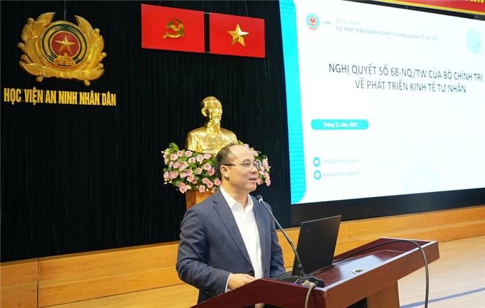Ngày 12/11/2025, Học viện An ninh nhân dân tổ chức Hội nghị quán triệt và triển khai thực hiện Nghị quyết số 68-NQ/TW ngày 04/5/2025 của Bộ Chính trị về phát triển kinh tế tư nhân. PGS.TS, Thiếu tướng Trịnh Ngọc Quyên, Bí thư Đảng uỷ, Giám đốc Học viện chủ trì Hội nghị. Đồng chí Bùi Anh Tuấn, Cục trưởng Cục Phát triển doanh nghiệp tư nhân và kinh tế tập thể, Bộ Tài chính dự và báo cáo chuyên đề.