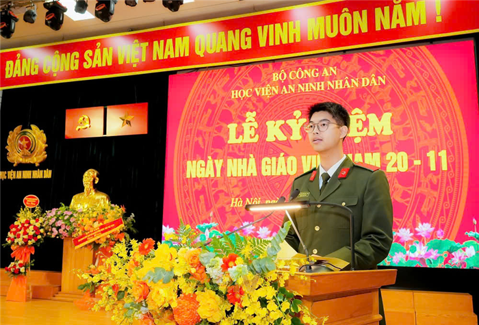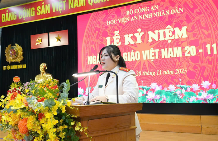 TS, Thiếu tá Nguyễn Thị Huyền Trang, đại diện cho đội ngũ giảng viên và cán bộ quản lý giáo dục đang công tác tại Học viện trân trọng gửi lời tri ân sâu sắc tới các nhà giáo lão thành, các thầy, cô giáo, đội ngũ cán bộ quản lý giáo dục của Học viện; đồng thời cam kết, với sứ mệnh cao cả của người giáo viên CAND sẽ đồng lòng, quyết tâm, giữ gìn và phát huy truyền thống “Tôn sư trọng đạo”, xây dựng môi trường giáo dục mẫu mực, trong sạch, nhân văn và kỷ cương.