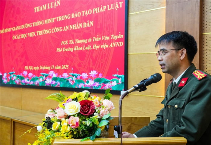 Được sự ủy quyền của đồng chí Phó Giám đốc Học viện, PGS.TS, Đại tá Nguyễn Trung Kiên - Chánh Văn phòng Học viện phát biểu đề dẫn tại Hội thảo. Đồng chí nhấn mạnh, trong bối cảnh cả hệ thống chính trị đang đẩy mạnh chuyển đổi số quốc gia hướng tới Chính phủ số, xã hội số và công dân số, công tác chuyển đổi số trong lực lượng CAND được Bộ Công an xác định là nhiệm vụ trọng tâm, mang ý nghĩa chiến lược nhằm xây dựng lực lượng CAND chính quy, tinh nhuệ, hiện đại. Việc ứng dụng công nghệ số và dữ liệu số trong giáo dục, tuyên truyền, giảng dạy pháp luật giúp nâng cao hiệu quả truyền đạt và tạo môi trường học tập pháp luật thông minh, phù hợp yêu cầu đào tạo cán bộ trong giai đoạn mới.