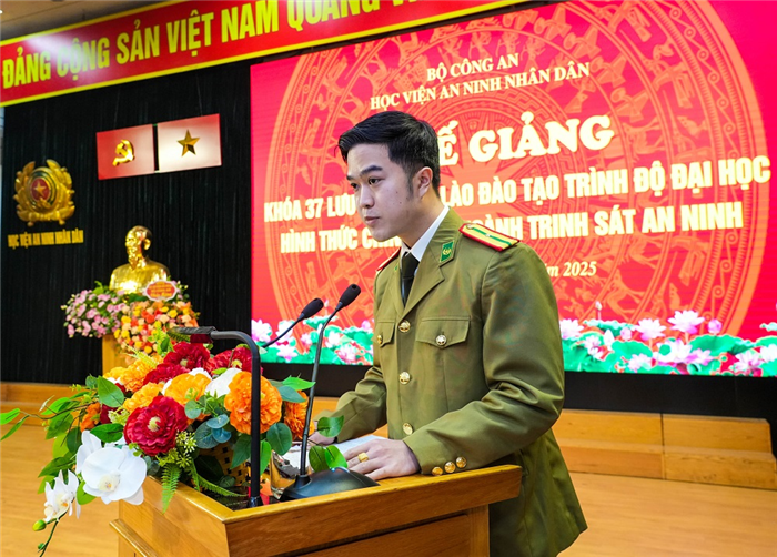 Phát biểu cảm tưởng tại buổi Lễ, đại diện cho học viên toàn Khoá học, học viên Khun Pạ Sổng Phạ Xay Sổm Bắt - Lớp D37 Trinh sát an ninh trân trọng gửi lời cảm ơn sâu sắc đến Đảng ủy, Ban Giám đốc Học viện, các thầy cô giáo, các đơn vị chức năng đã quan tâm, tạo mọi điều kiện để học viên hoàn thành tốt nhiệm vụ học tập. Đồng thời xin hứa, sau khi trở về nước sẽ nêu cao tinh thần trách nhiệm, tích cực học hỏi, trau dồi kiến thức, vận dụng linh hoạt, sáng tạo những kiến thức đã được truyền thụ vào thực tiễn công tác.