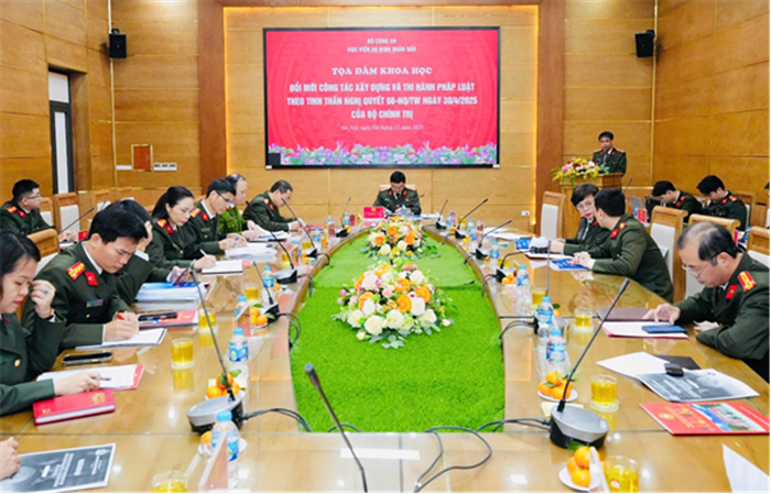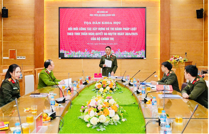 Ngày 04/12/2025, Học viện An ninh nhân dân đã tổ chức Tọa đàm khoa học “Đổi mới công tác xây dựng và thi hành pháp luật theo tinh thần Nghị quyết số 66-NQ/TW ngày 30/4/2025 của Bộ Chính trị”. Đây là hoạt động nằm trong Kế hoạch số 488/KH-BCA-V03, ngày 12/8/2025 của Bộ Công an về thực hiện Nghị quyết số 66-NQ/TW của Bộ Chính trị về đổi mới công tác xây dựng và thi hành pháp luật đáp ứng yêu cầu phát triển đất nước trong kỷ nguyên mới.