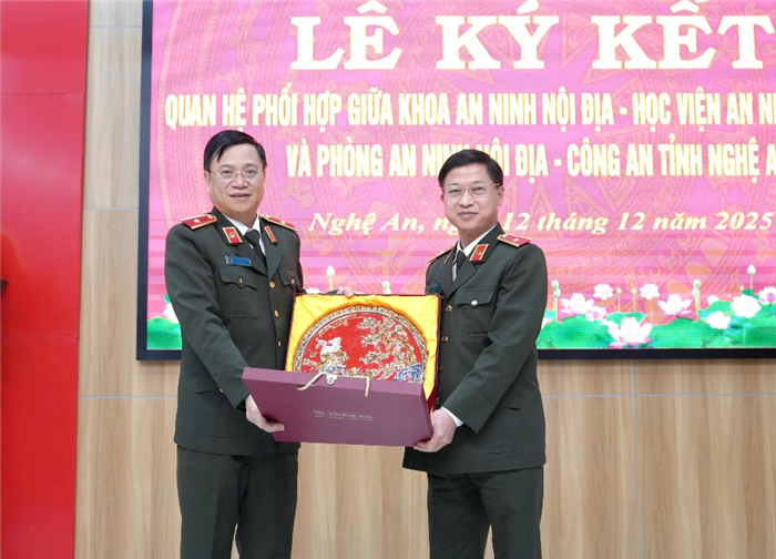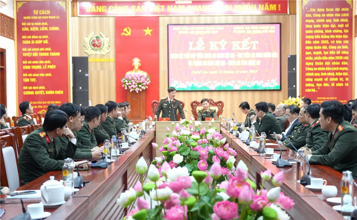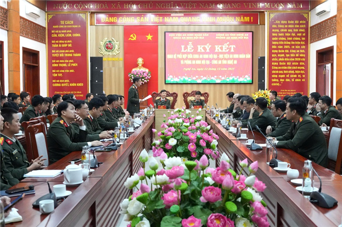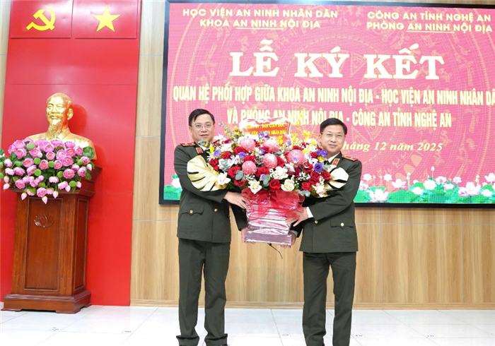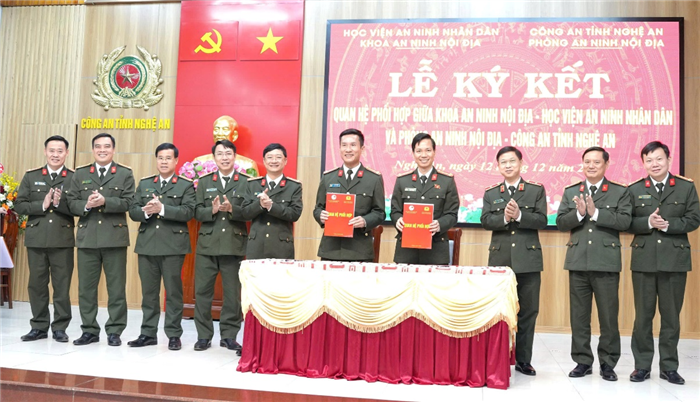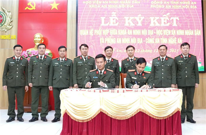 Ngày 12/12/2025, Khoa An ninh nội địa, Học viện An ninh nhân dân phối hợp với Phòng An ninh nội địa, Công an tỉnh Nghệ An tổ chức Lễ ký kết quan hệ phối hợp giữa hai đơn vị. PGS.TS, Thiếu tướng Trần Anh Vũ, Phó Bí thư Đảng ủy, Phó Giám đốc Học viện An ninh nhân dân và Đại tá Trần Ngọc Tuấn, Phó Giám đốc Công an tỉnh Nghệ An đồng chủ trì buổi Lễ.