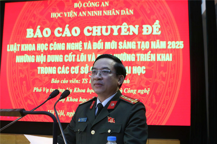 Phát biểu quán triệt chỉ đạo tại buổi báo cáo chuyên đề, PGS.TS, Thượng tá Nguyễn Hồng Thái, Phó Giám đốc Học viện nhấn mạnh, đẩy mạnh phát triển khoa học, công nghệ và đổi mới sáng tạo được Đảng và Nhà nước xác định là động lực then chốt cho sự nghiệp công nghiệp hóa, hiện đại hóa và phát triển kinh tế tri thức. Hệ thống chính sách, pháp luật về lĩnh vực này đang ngày càng hoàn thiện, tạo hành lang pháp lý thúc đẩy nghiên cứu, chuyển giao công nghệ và nâng cao chất lượng nhân lực trong kỷ nguyên mới. Việc ban hành Luật Khoa học, Công nghệ và Đổi mới sáng tạo năm 2025 là bước cụ thể hóa quan trọng các chủ trương, nghị quyết lớn của Đảng, nhất là Nghị quyết số 57-NQ/TW của Bộ Chính trị về đột phá phát triển khoa học, công nghệ, đổi mới sáng tạo và chuyển đổi số quốc gia; khẳng định vai trò trung tâm của khoa học, công nghệ và đổi mới sáng tạo trong phát triển kinh tế – xã hội, bảo đảm quốc phòng, an ninh và hội nhập quốc tế. Đối với các trường đại học, đây không chỉ là chuyên môn mà còn là trụ cột chiến lược để nâng cao chất lượng đào tạo và phát triển đội ngũ nhà khoa học.