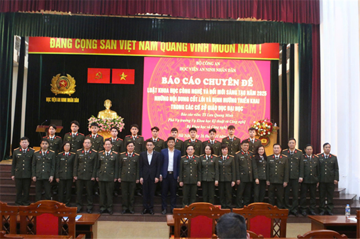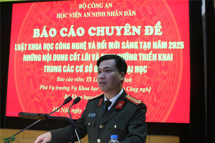 Thực hiện chương trình công tác năm học 2025 - 2026, Ngày 16/01/2026, Học viện An ninh nhân dân tổ chức buổi báo cáo chuyên đề với chủ đề: “Luật Khoa học, Công nghệ và Đổi mới sáng tạo năm 2025, những nội dung cốt lõi và định hướng triển khai trong các cơ sở giáo dục đại học” do đồng chí TS Lưu Quang Minh, Phó Vụ trưởng Vụ Khoa học Kỹ thuật và Công nghệ, Bộ Khoa học và Công nghệ trình bày.