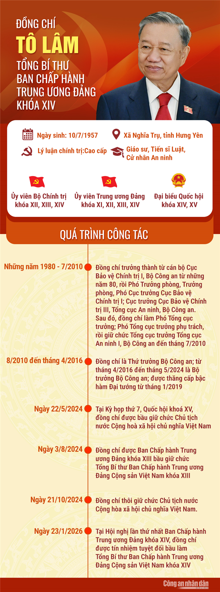 Ngày 23/1, tại Hội nghị lần thứ nhất Ban Chấp hành Trung ương Đảng khoá XIV, Ban Chấp hành Trung ương Đảng khóa XIV đã thống nhất tuyệt đối bầu đồng chí Tô Lâm, Tổng Bí thư Ban Chấp hành Trung ương Đảng khóa XIII tiếp tục giữ chức Tổng Bí thư Ban Chấp hành Trung ương Đảng khóa XIV.