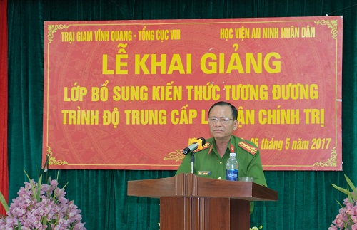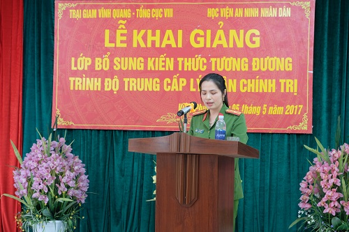 Lễ khai giảng lớp bổ sung kiến thức tương đương trình độ trung cấp lý luận chính trị mở tại Trại giam Vĩnh Quang - Tổng cục VIII năm 2017 diễn ra thành công tốt đẹp. Kết thúc khoá học, những học viên hoàn thành nhiệm vụ học tập sẽ được Giám đốc Học viện ANND cấp chứng nhận “Hoàn thành chương trình bổ sung kiến thức tương đương trình độ trung cấp lý luận chính trị”.