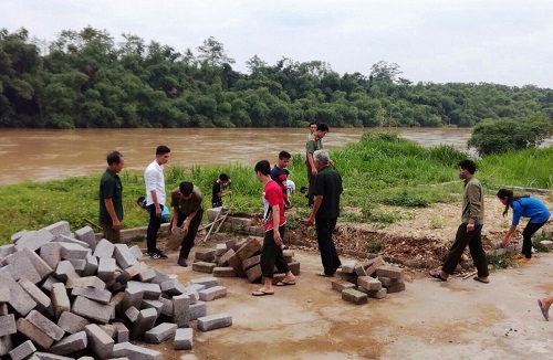 Các thành viên trong đoàn tình nguyện cùng nhân dân địa phương xây dựng bục