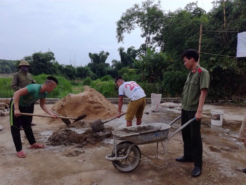 Đoàn tình nguyện Học viện an ninh nhân dân trao quà hỗ trợ xóm Đò xã Nga My xây dựng bục sân khấu. |