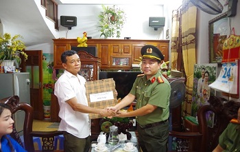 Thiếu tá Vũ Văn Hưng – Phó trưởng phòng QLHV trao quà của đoàn công tác cho đại diện một gia đình thương binh tại phường Văn Quán |