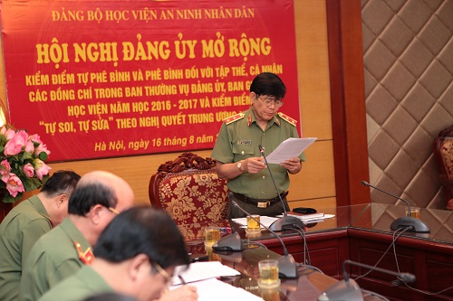 Thực hiện Thông tư 06 của Bộ Công an về nhận xét, đánh giá cán bộ hàng năm và kiểm điểm “tự soi, tự sửa” theo Nghị quyết Trung ương 4 khoá XII, ngày 16/8/2017, Đảng uỷ Học viện An ninh nhân dân đã tổ chức Hội nghị Đảng uỷ mở rộng kiểm điểm tự phê bình và phê bình đối với tập thể, cá nhân các đồng chí trong Ban Thường vụ Đảng uỷ, Ban Giám đốc Học viện năm học 2016-2017.