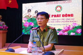 Thực hiện Thông tư số 27/TT-BCA của Bộ trưởng Bộ Công an quy định về quy tắc ứng xử của Công an nhân dân, tối ngày 24/10/2017, Ban chủ nhiệm Chuyên khoa I (CKI) - Phòng Quản lý học viên - Học viện An ninh nhân dân đã tổ chức Lễ phát động thực hiện quy tắc ứng xử trong học viên Chuyên khoa.