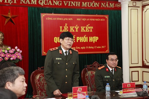 Phát biểu tại buổi lễ, Trung tướng GS.TS Nguyễn Văn Ngọc - Giám đốc Học viện An ninh nhân dân nhấn mạnh: Thời gian qua, công tác phối hợp giữa Học viện An ninh nhân dân và Công an tỉnh Lạng Sơn đã có nhiều hiệu quả trong công tác bồi dưỡng nghiệp vụ cho cán bộ, chiến sĩ Công an tỉnh, cũng như công tác tiếp nhận cán bộ, giảng viên và sinh viên của Học viện đến thực tế, thực tập. Việc kí kết Quy chế phối hợp là dấu mốc lịch sử quan trọng giữa hai đơn vị, là cơ sở để tăng cường và mở rộng hơn nữa sự phối hợp chặt chẽ và tình cảm truyền thống giữa hai đơn vị.