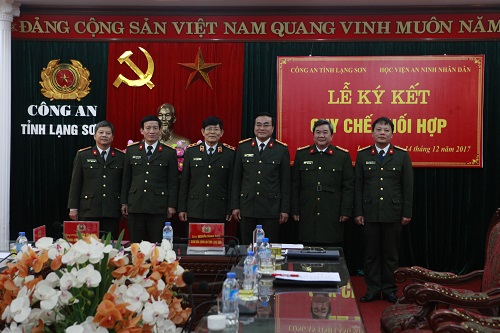 Ngày 14/12/2017, tại Hội trường lớn Công an tỉnh Lạng Sơn đã diễn ra Lễ ký kết Quy chế phối hợp giữa Học viện An ninh nhân dân và Công an tỉnh Lạng Sơn nhằm tăng cường quan hệ phối hợp trong đào tạo, bồi dưỡng, tập huấn nghiệp vụ cho lãnh đạo, cán bộ, chiến sĩ Công an tỉnh; công tác đưa cán bộ, giảng viên, học viên nghiên cứu thực tiễn, tổ chức thực tập, thực tế tại Công an tỉnh; đồng thời, phát huy tình cảm và truyền thống tốt đẹp giữa Học viện An ninh nhân dân và Công an tỉnh Lạng Sơn.