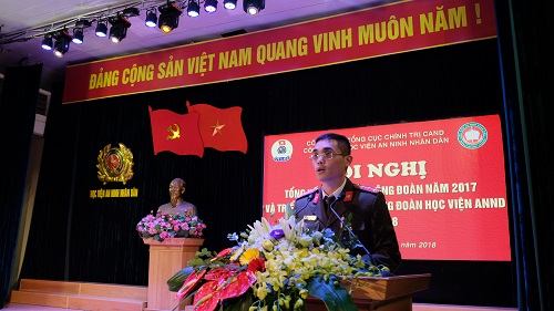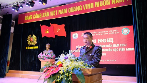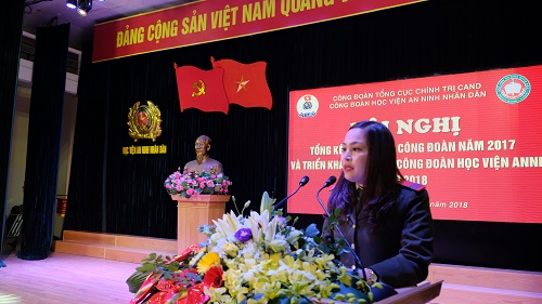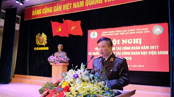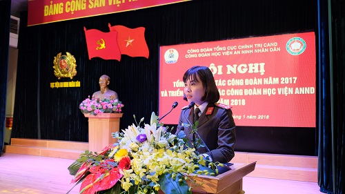 Tại Hội nghị đồng chí Chủ tịch Công đoàn Học viện ANND báo cáo tổng kết công tác công đoàn 2017, đánh giá kết quả đã đạt được, kiểm điểm tồn tại, hạn chế, đề ra phương hướng, mục tiêu, nhiệm vụ công tác Công đoàn học viện 2018, đồng thời phát động phong trào thi đua cho hoạt động Công đoàn trong 2018.