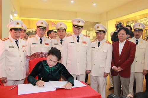 Chủ tịch Quốc hội Nguyễn Thị Kim Ngân viết lưu niệm tại Nhà truyền thống khu lưu niệm Sáu điều Bác Hồ dạy CAND.