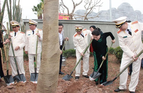 Chủ tịch Quốc hội Nguyễn Thị Kim Ngân; Thượng tướng Tô Lâm, Bộ trưởng Bộ Công an trồng cây lưu niệm tại Khu lưu niệm Sáu điều Bác Hồ dạy CAND.