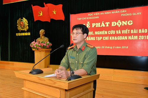 Trong Diễn văn phát động học viên đọc, nghiên cứu và viết bài báo khoa học đăng Tạp chí KH&GDAN, Thượng tá.TS Phan Bá Toản - Tổng Biên tập giới thiệu về Tạp chí KKH&GDAN và khẳng định: Tạp chí KH&GDAN là một tài liệu có giá trị, bổ ích và thiết thực đối với học viên, cung cấp cho học viên những thông tin về lý luận và thực tiễn bảo vệ ANQG, chính trị, pháp luật, tâm lý nghiệp vụ; về phương pháp dạy học đại học; trao đổi những vấn đề học thuật; những kinh nghiệm của các nước trong bảo vệ ANQG. Đồng thời, chia sẻ về những lợi ích của việc tham gia viết bài báo khoa học đối với học viên đang học tập, rèn luyện tại Học viện. Đồng chí Tổng Biên tập nhấn mạnh sự cần thiết của việc tổ chức Lễ phát động học viên đọc, nghiên cứu và viết bài báo khoa học; kêu gọi học viên toàn Học viện tích cực tham gia hưởng ứng lễ phát động.