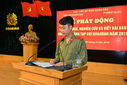 Tại Lễ phát động, học viên Trần Trung Dũng, lớp B12D48 đại diện cho học viên toàn Học viên phát biểu hưởng ứng và hứa quyết tâm tạo những chuyển biến mạnh mẽ trong nhận thức của học viên về ý nghĩa, tầm quan trọng của văn hóa đọc nói chung và nghiên cứu, đọc Tạp chí KH&GDAN nói riêng. Đồng thời, học viên Học viện sẽ tăng cường học hỏi, sớm tham gia viết được các bài báo khoa học để gửi đăng trên Tạp chí.