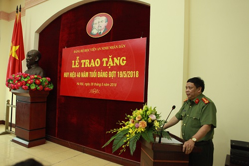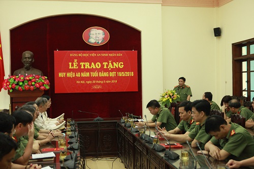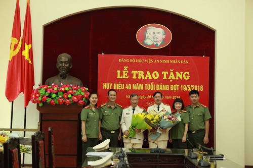 Đảng bộ Học viện có 02 đảng viên lão thành được tặng Huy hiệu 40 năm tuổi Đảng là đồng chí Trung tướng, PGS.TS Nông Văn Lưu - chi bộ Trung tâm Nghiên cứu An ninh quốc gia, Đảng bộ Viện Khoa học An ninh; đồng chí Thiếu tướng, GS.TS Nguyễn Thủ Thanh - chi bộ Trung tâm Nghiên cứu và phát triển lý luận, Đảng bộ Viện Khoa học An ninh. Đồng chí Đại tá, PGS. TS Lê Văn Thắng - Bí thư Đảng ủy, Giám đốc Học viện thừa ủy quyền của Đảng ủy Công an Trung ương đã trao và gắn Huy hiệu 40 năm tuổi Đảng cho 02 đồng chí.