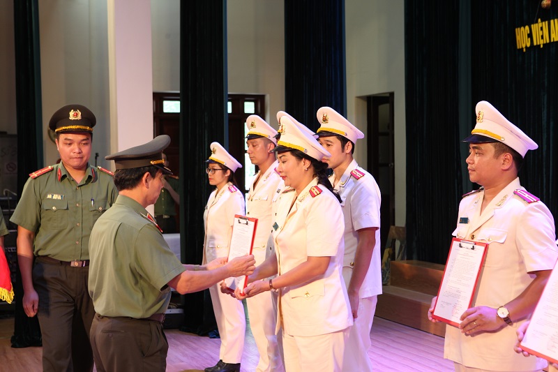 Đại tá, PGS.TS Lê Ngọc An - Phó Giám đốc Học viện trao Quyết định cho các đồng chí được thăng cấp bậc hàm Đại úy năm 2018.