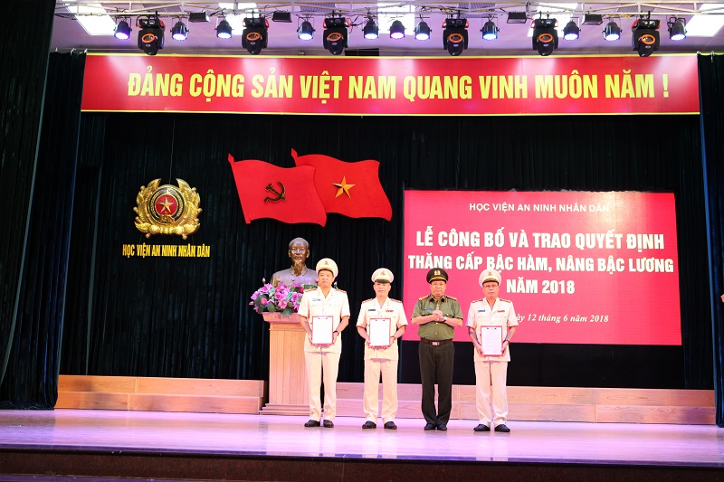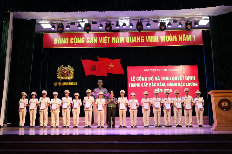 Trong không khí phấn khởi chào mừng kỷ niệm 72 năm ngày truyền thống của Học viện(25/6/1946 - 25/6/2018). Thừa uỷ quyền của Bộ trưởng Bộ Công an và Tổng cục Chính trị CAND, chiều ngày 12/6/2018, Học viện An ninh nhân dân đã long trọng tổ chức Lễ Công bố các Quyết định thăng cấp bậc hàm, nâng bậc lương năm 2018. Đại tá Lê Văn Thắng, Bí thư Đảng uỷ, Giám đốc Học viện, chủ trì buổi Lễ; tham dự buổi lẽ có các đồng chí trong Đảng uỷ, Ban Giám đốc Học viện; sĩ quan cấp Tướng; các Giáo sư, Phó Giáo sư; Lãnh đạo các đơn vị trong Học viện; đại diện các đoàn thể, quần chúng và toàn thể các đồng chí được thăng cấp bậc hàm, nâng bậc lương năm 2018.