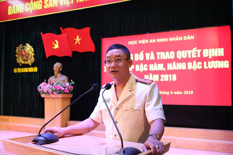 Thay mặt Đảng ủy, Ban Giám đốc Học viện, đồng chí Đại tá Lê Văn Thắng, Bí thư Đảng uỷ, Giám đốc Học viện phát biểu chúc mừng và giao nhiệm vụ cho các đồng chí được thăng cấp bậc hàm, nâng bậc lương năm 2018 tiếp tục rèn luyện, giữ vững bản lĩnh chính trị, không ngừng tu dưỡng về phẩm chất đạo đức cách mạng, nỗ lực, phấn đấu góp sức mình xây dựng Học viện An ninh nhân dân ngày càng phát triển, sớm trở thành trường chuẩn Quốc gia.