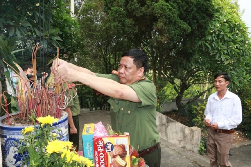 Đại tá, PGS.TS Lê Văn Thắng - Giám đốc Học viện An ninh nhân dân thắp hương và đặt vòng hoa tưởng niệm các anh hùng, liệt sĩ tại Nghĩa trang xã Khải Xuân.