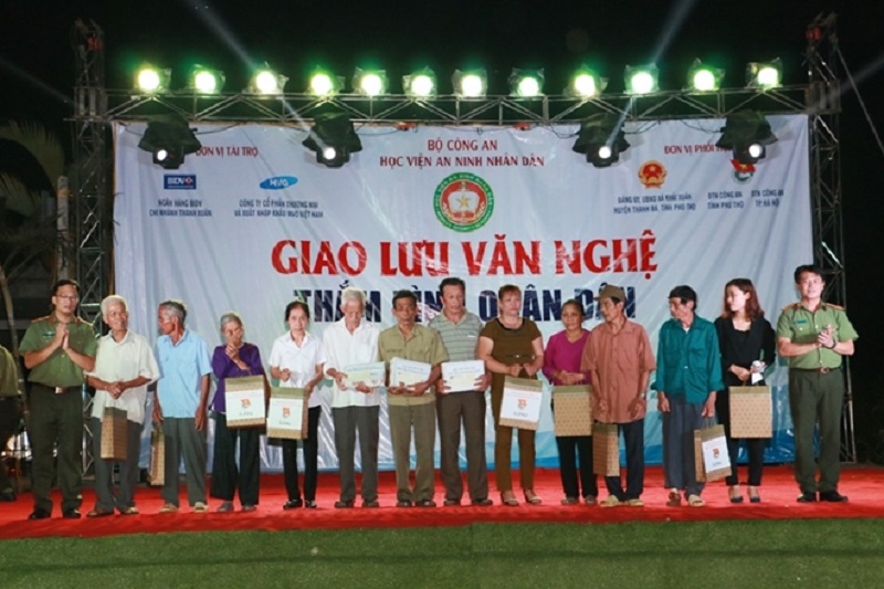 Tại đêm giao lưu, thay mặt đoàn công tác Đại tá, PGS.TS Lê Văn Thắng - Bí thư Đảng ủy, Giám đốc Học viện ANND phối hợp cùng Ngân hàng BIDV chi nhánh Thanh Xuân trao tặng 50 xe đạp cùng 20 suất quà cho các em học sinh nghèo vượt khó tại các trường trên địa bàn xã Khải Xuân; tặng 20 suất quà cho các gia đình chính sách trên địa bàn. Cũng trong dịp này đoàn công tác đã trao tặng 9 bộ máy tính cho Công an huyện Thanh Ba, UBND xã Khải Xuân, trạm Y tế xã, Trường tiểu học và THPT xã Khải Xuân.