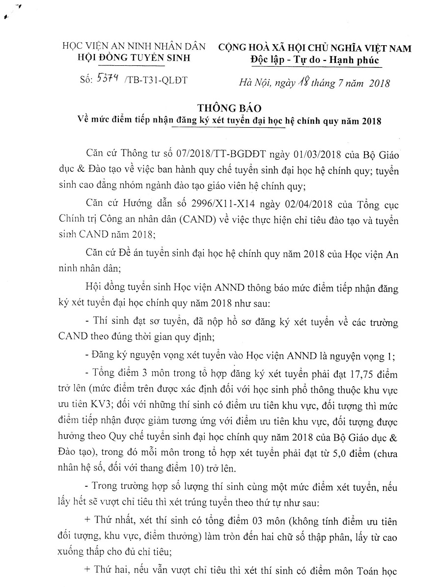 Theo thông báo số 5374/TB-T31-QLĐT, Học viện An ninh nhân dân thông báo mức điểm tiếp nhận đăng ký xét tuyển đại học hệ chính quy năm 2018 cụ thể như sau: