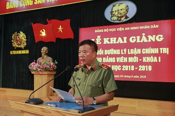 Lớp bồi dưỡng lý luận chính trị cho đảng viên mới khóa I, năm học 2018 - 2019 được tổ chức trong thời điểm toàn Đảng, toàn quân đang tích cực học tập, quán triệt, triển khai thực hiện Nghị quyết Trung ương 7 khóa XII của Đảng; Học viện ANND đang khẩn trương triển khai các mặt công tác đầu năm học mới, Đảng ủy Học viện mong rằng các đồng chí có vinh dự tham gia lớp học này sẽ tiếp tục phát huy vai trò tiên phong, gương mẫu của mình trên mọi lĩnh vực công tác, học tập, rèn luyện, góp phần xây dựng Đảng bộ Học viện ngày càng trong sạch, vững mạnh.