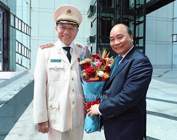 Bộ trưởng Tô Lâm tặng hoa Thủ tướng Chính phủ Nguyễn Xuân Phúc. |